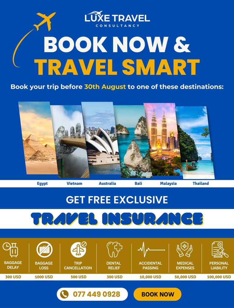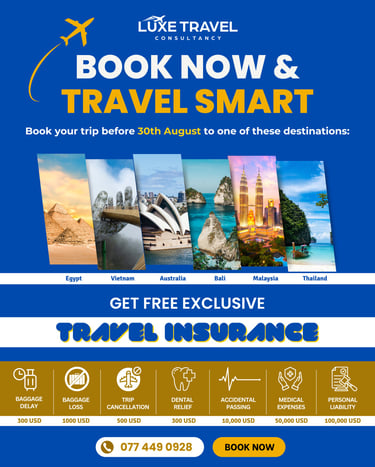 #FreeTravelInsurance #LuxeTravel #TravelSmart #LuxuryTravel #BookNow #TravelWithPeaceOfMind #SriLankaTravelAgent #LuxeExclusive